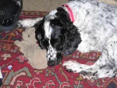 Photo number 2: the dog with one of my Moms pantyhoses that are still around. She always loved them, and she still does.